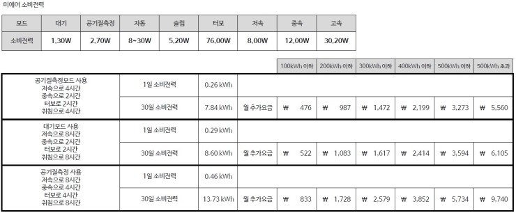 그렇다면 추가 요금은 1,500원 정도 되는 거네요. 하루 종일 끄지 않고 사용해도 2,500원 남짓이네요.