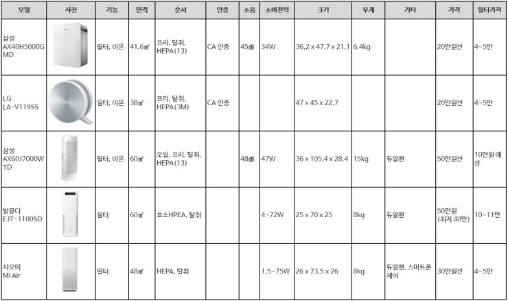 가격차이만큼 공기청정능력이 차이 나지는 않는다는 결론!