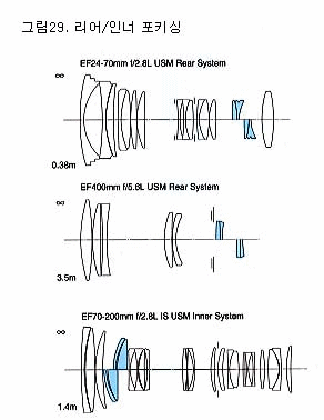 기존의 포커싱 기법은 크게 렌즈의 전체가 움직이는 방법 렌즈의 전(前)군만 움직이는 방법으로 나눠졌습니다. 렌즈 전체가 움직이는 방법은 초점이 변화됨에 따른 수차 발생이 적다는 점이 있었지만 렌즈의 이동 부분이 많은 관계로 단 렌즈에서 주로 사용되었으며, 렌즈의 전군이 움직이는 방법은 간단하고 부담이 적은 방법으로 주로 줌 렌즈에서 사용되었습니다. 하지만 이러한 방법은 렌즈의 이동부가 많거나 길이의 변화가 생겨 사용에 불편함이 발생하며 망원렌즈로 갈수록 포커싱 부의 부담이 커져 조작이 어려워진다는 단점을 가지고 있습니다. 그 결과 개발된 방법이 내부 포커싱 기법입니다. ![]() *캐논에서는 포커싱 부분이 조리개 전에 있으면 Inner Focusing, 조리개 뒤에 있으면 Rear Focusing이라고 부릅니다.  |
