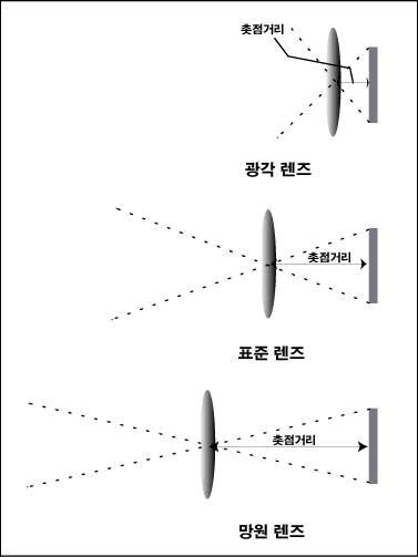 초점거리는 렌즈의 특성을 구분 짓는 큰 요소이며 그중에서 가장 큰 특징은 바로 화각을 결정하는 부분이라고 할 수 있습니다. ![]() 위의 그림과 같이 초점거리에 따라서 동일한 크기의 이미지 센서(필름)에 담기는 화각이 달라집니다. ![]()