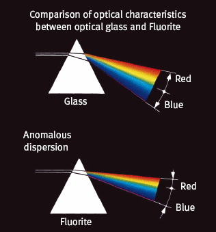 빛은 어떠한 물질을 통과할 때 파장에 따라서 다른 굴절각을 가집니다. 이러한 이유로 렌즈를 통과한 빛은 색수차 현상을 가지게 되며 이는 보다 이상적인 이미지를 만들어내는데 문제점이 되어왔습니다. 색수차 현상을 제거하기 위해서 서로 다른 굴절 지수를 가지는 렌즈를 조합하여 사용하며 다양한 렌즈 설계가 진행되었습니다. 하지만 굴절지수 차이의 렌즈 조합에서 적색광과 청색광의 일치는 가능했지만 중간 파장의 녹색광 계열에서는 초점일치가 어려웠습니다. (이렇게 굴절지수 차이를 이용한 조합 렌즈는 Achromatic 렌즈라고 합니다.) 이렇게 남겨진 색수차를 잔존 색수차 혹은 제2차 스펙트럼이라고 부르며 이 색수차는 일반 광학 유리를 사용하는 한 제거하기 힘들었습니다. ![]() 보다 향상된 이미지를 만들기 위해서는 잔존 색수차를 확실히 제거할 필요가 있었으며, 이를 위해서 분산도가 낮은 렌즈를 만들 필요가 있었습니다. 카메라용 렌즈의 개발 이전에 이러한 문제를 해결하는 물체로 현미경에서 형석(fluorite)을 사용하고 있었습니다. 형석은 일반 광학유리와 다르게 저 굴절 및 저 분산의 특징을 가지고 있었습니다. 또한 파장에 따른 굴절률 차이가 독특해 적색에서 녹색까지는 일정한 굴절률을 가지지만 녹색에서 청색까지는 현저하게 큰 굴절률을 가지고 있어 초망원 렌즈의 묘사 능력을 뛰어나게 해주는 성향을 가지고 있었습니다. ![]() 하지만 이런 자연산 형석은 결정의 크기가 작았고, 순도가 낮았기 때문에 카메라용 렌즈에 사용하기 어려웠습니다. 따라서 이러한 성향을 가지는 렌즈 제작을 목표로 각 렌즈 제조사에서는 저분산 렌즈를 제작하기 위해 많은 투자를 하였습니다. (캐논에서는 이러한 형석의 결정을 맺는 별도의 인공 형석 제작에 성공하였으며, 현재 생산되는 렌즈에 사용하고 있습니다.)  |